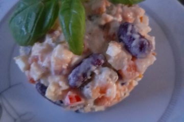 Pachnące i aromatyczne warzywa ugotowane w rosole, z dodatkiem innych warzyw tworzą super smaczną sałatkę.