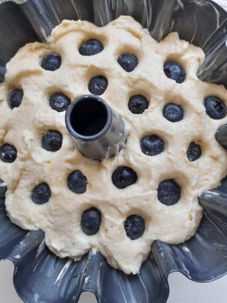 • Foremkę na babkę o średnicy 26 cm wysmarować wyłożyć ciasto i umieścić borówki.