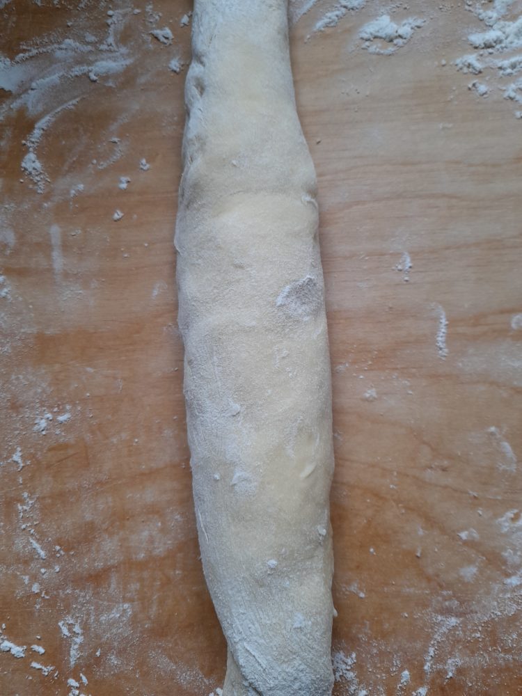 - Gdy ciasto podwoi swoją objętość wyłożyć na stolnicę podsypaną mąką. Podzielić na 4 części. Każdą część rozwałkować , posmarować lekko masłem z kardamonem , zwinąć w rulon.