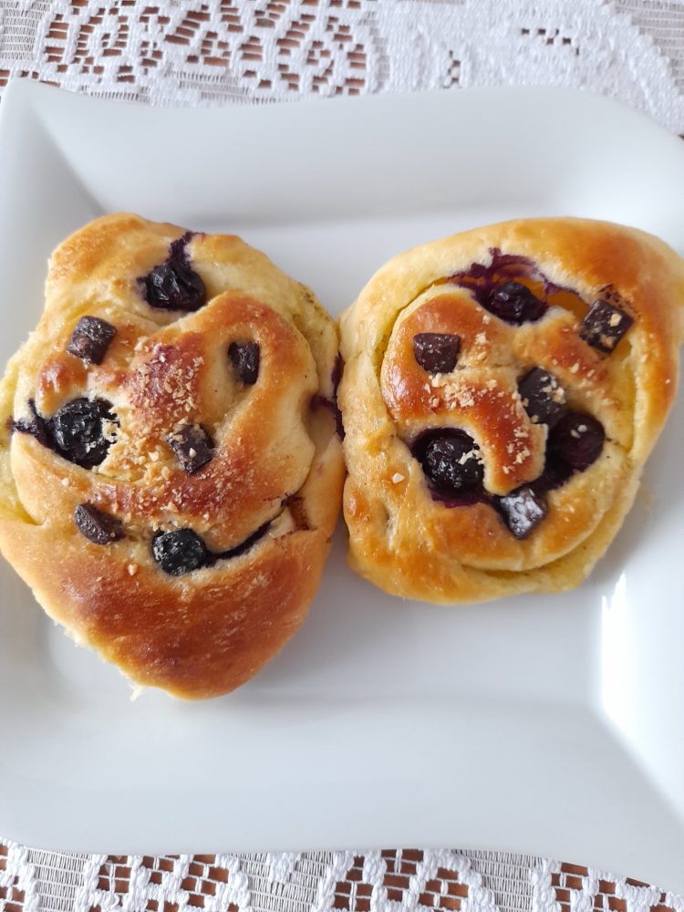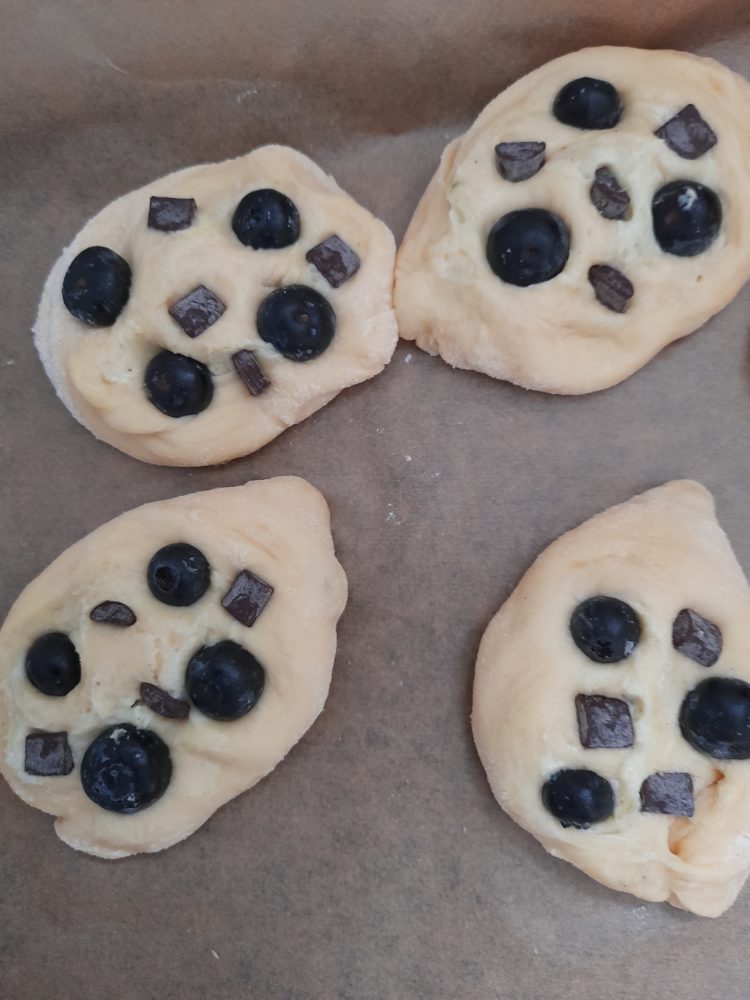 - Podzielić na 6 części. Każdą lekko spłaszczyć i układać na blaszce wyłożonej papierem do pieczenia. W miejsca zwinięcia ciasta włożyć borówki oraz kostki czekolady. Tak postępować do wyczerpania składników.