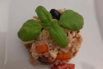 Połączenie ryżu , tuńczyka oraz warzyw , tworzy smaczną sałatkę na kolację i nie tylko.