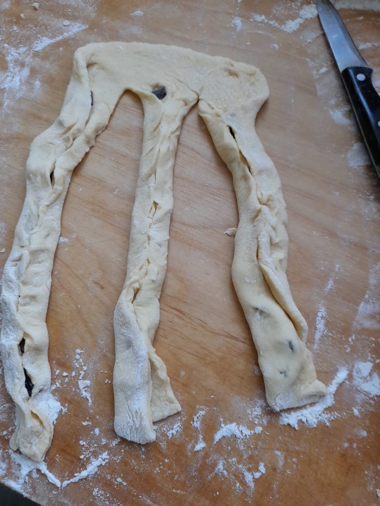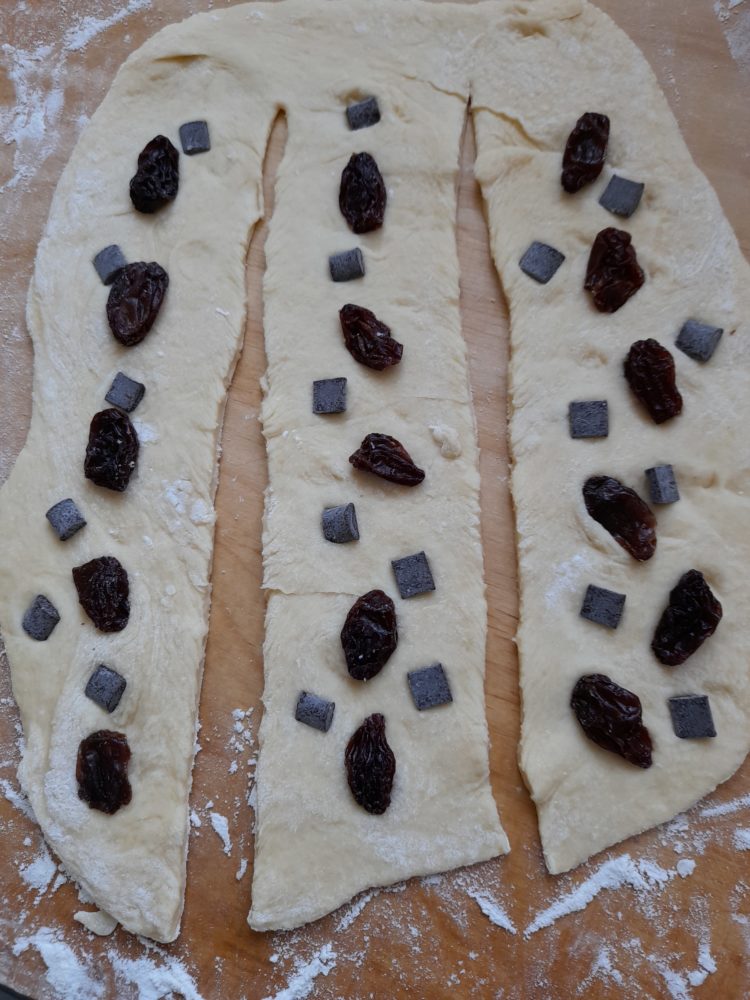 - Gdy ciasto podwoi swoją objętość , podsypać mąką i wyłożyć na stolnicę. Podzielić na 2 lub 4 części , jakie chcemy chałki , większe lub mniejsze. U mnie na 4 części. Każdą część rozwałkować i naciąć od jednej strony na 3 paski , na każdym ułożyć czekoladę i rodzynki.