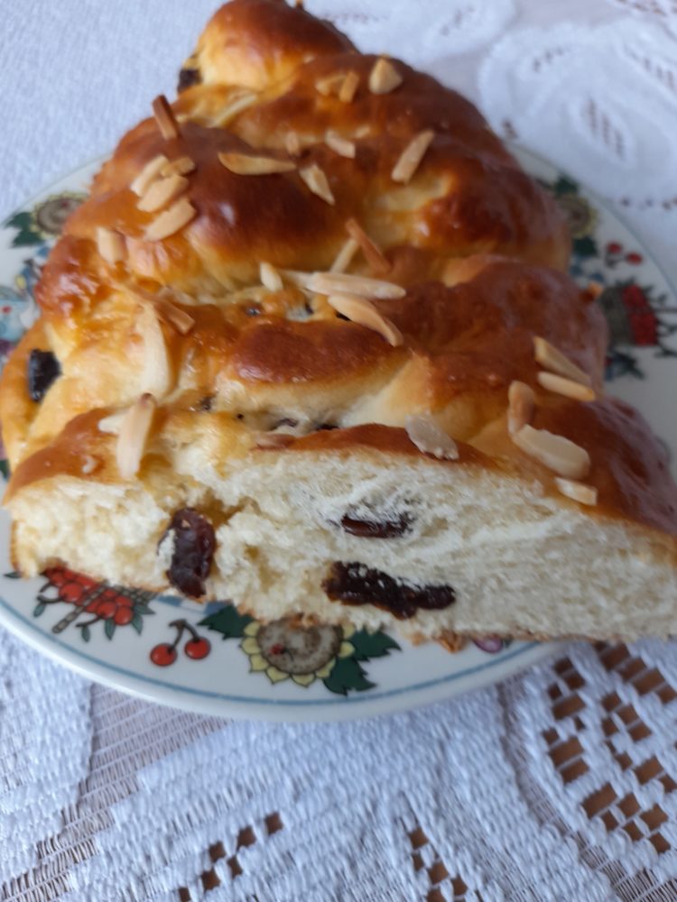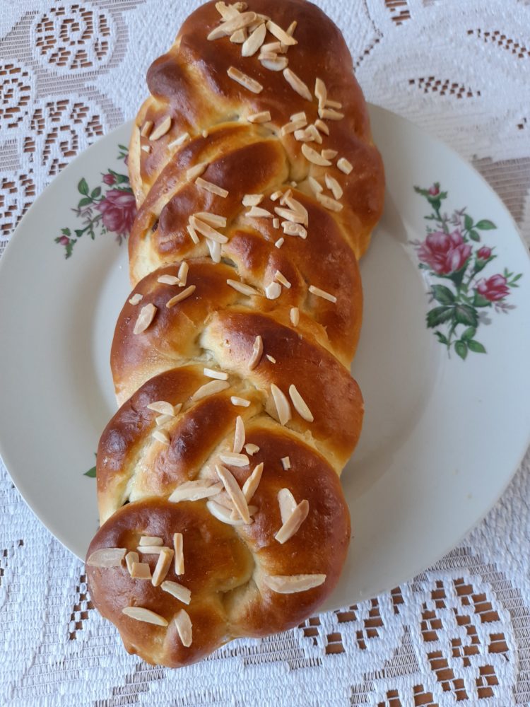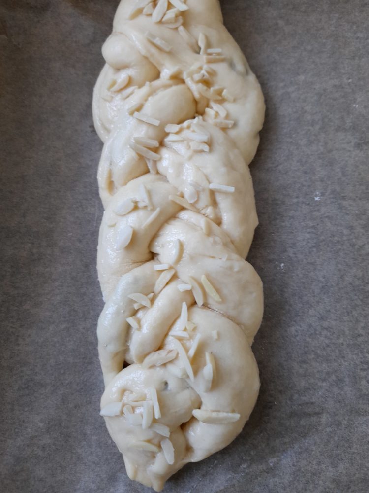 - Zapleść jak warkocz , chałkę i pozostawić do wyrośnięcia. Gdy podrośnie, posmarawać roztrzepanymi białkami , posypać słupkami migdałowymi.