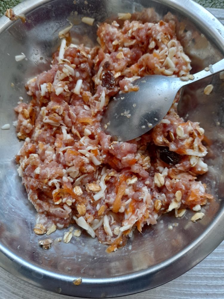 - Ser mozzarella utrzeć na tarce o grubszych otworach, utrzeć również paprykę dodać do mięsa, dodać płatki owsiane, wbić jajko , wszystko dokładnie wymieszać.