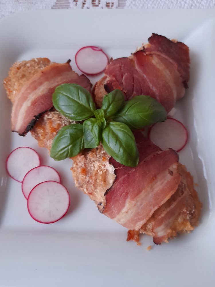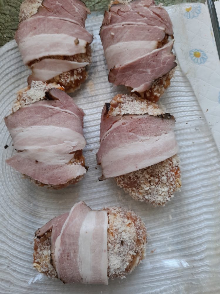 Mielone mięso wieprzowe z dodatkiem papryki sera mozzarella oraz płatek owsianych z żurawiną i rodzynkami nadają im puszystości. Otulone i zapieczone w aromatycznym boczku , idealne na obiad.