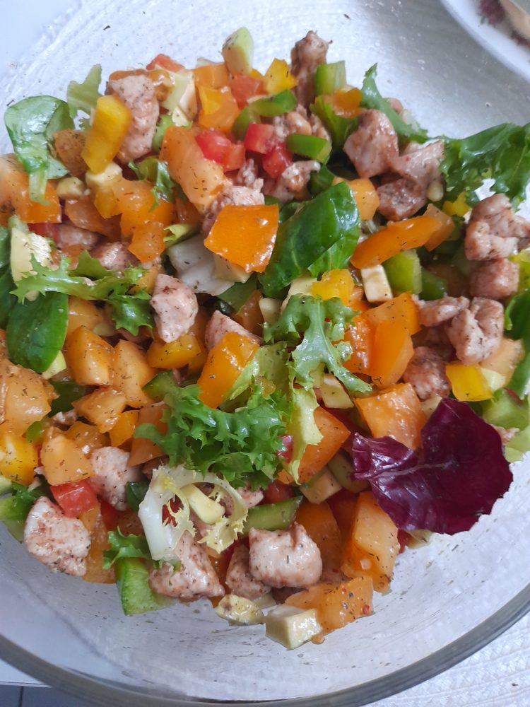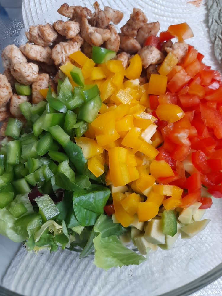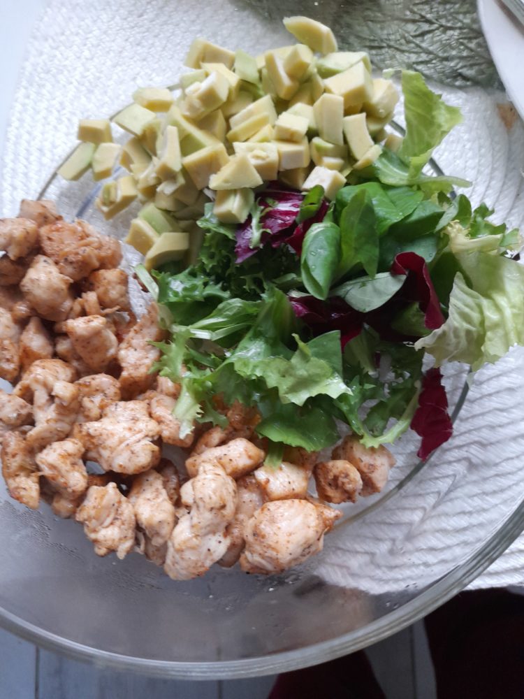 - Mix sałat umyć , dodać do salaterki. Awokado obrać , usunąć pestkę , pokroić w kostkę , dodać , lekko skropić sokiem z cytryny.