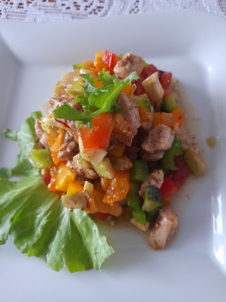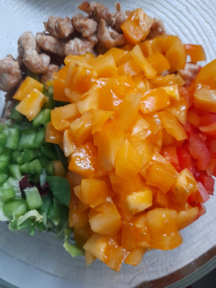 - Filet z kurczaka umyć , pokroić w kostkę , doprawić solą , pieprzem, przyprawą gyros , wymieszać, usmażyć. Umieścić w salaterce.