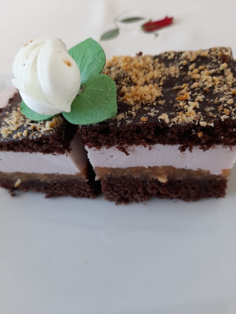 - Przykryć drugą połową ciasta. Czekoladę rozpuścić w kąpieli wodnej, wyłożyć, na ciasto , posypać mielonymi orzechami laskowymi. Schłodzić w lodówce , pokroić na porcje.