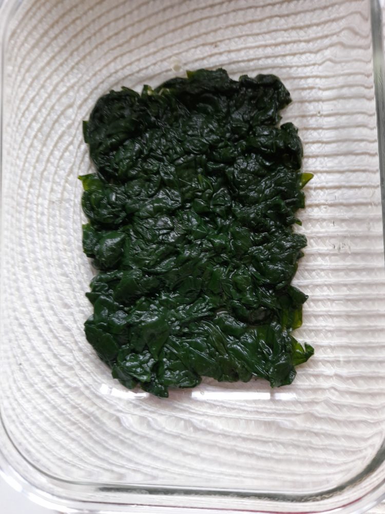 - Szpinak umyć usmażyć na oleju , umieścić w naczyniu do pieczenia.