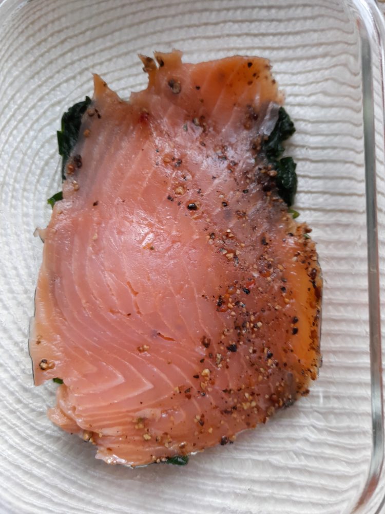 - Łososia natrzeć przyprawą do ryb oraz pieprzem cytrynowym.