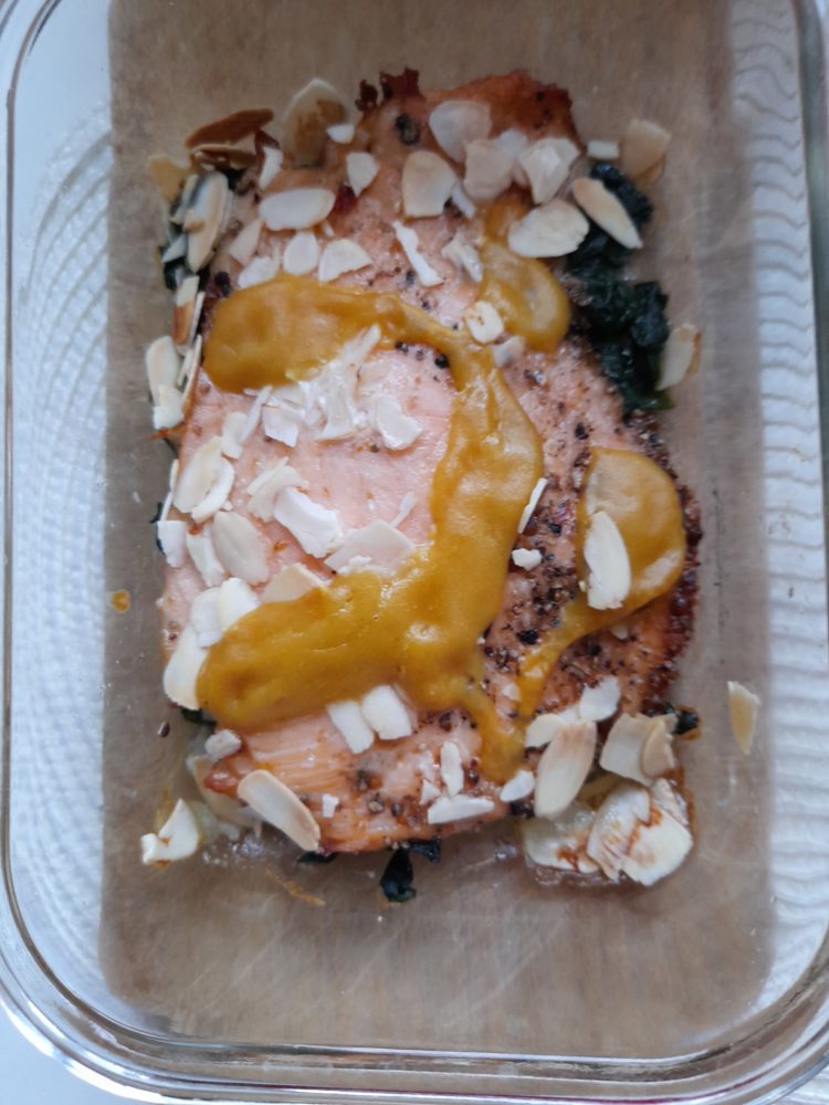 - Piekarnik rozgrzać do 180 stopni, można piec we frytownicy, wstawić przygotowanego łososia i piec 5 minut , wyjąć posypać płatkami migdałowymi i piec 8 minut .Musztardę wymieszać z miodem dodać sok z cytryny doprawić lekko solą . Tak przygotowanym sosem polać łososia i całość piec 5minut.