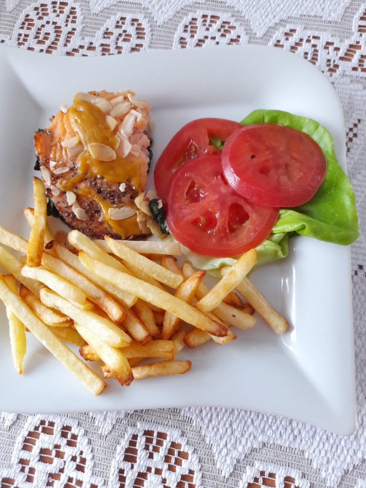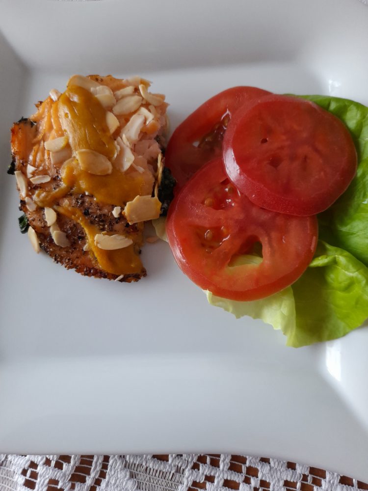 Łosoś pieczony na szpinaku z dodatkiem, migdałów i aromatycznego sosu, może być podany jako danie wigilijne lub z dodatkiem np. frytek jako danie obiadowe.