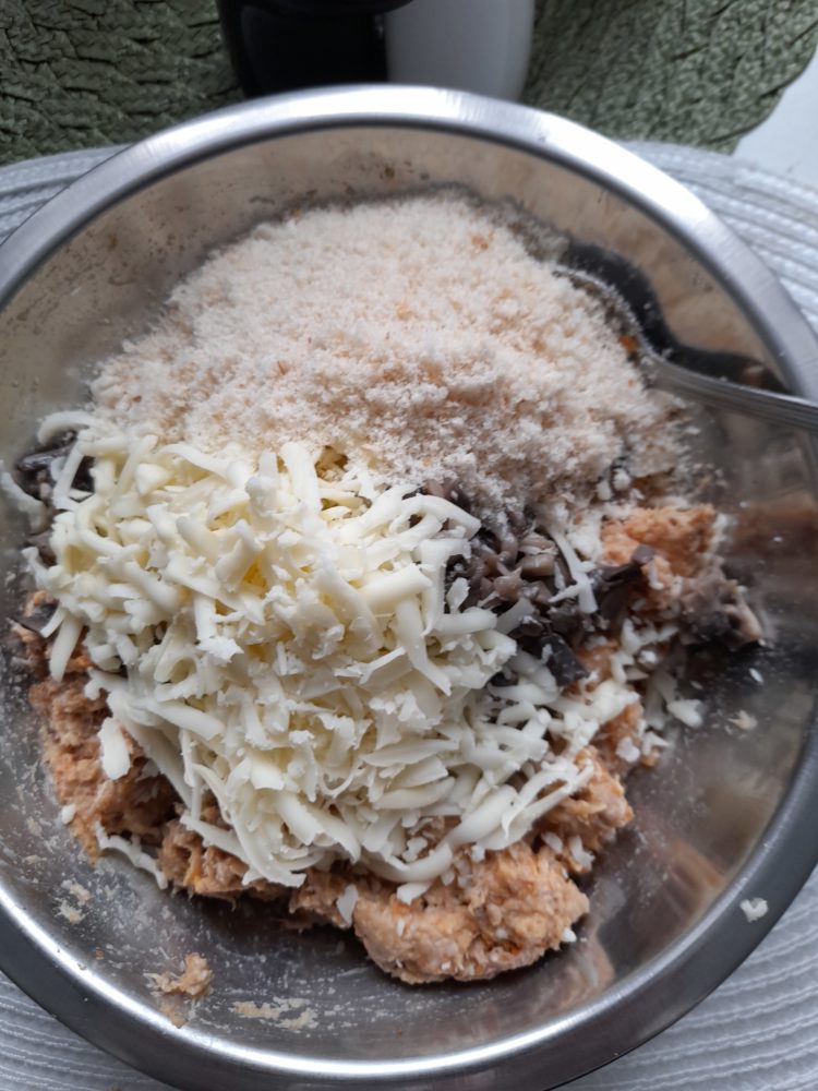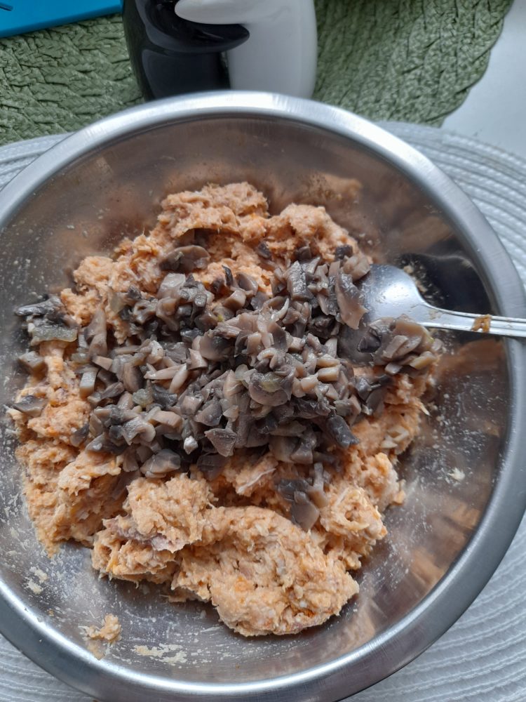 - Mięso oraz warzywa zemleć w maszynce lub zblendować. Pieczarki obrać , usmażyć, pokroić na drobno , dodać do mięsa.