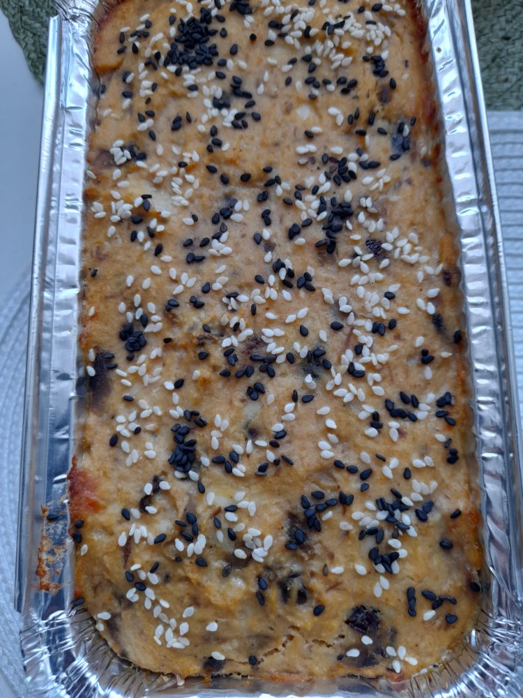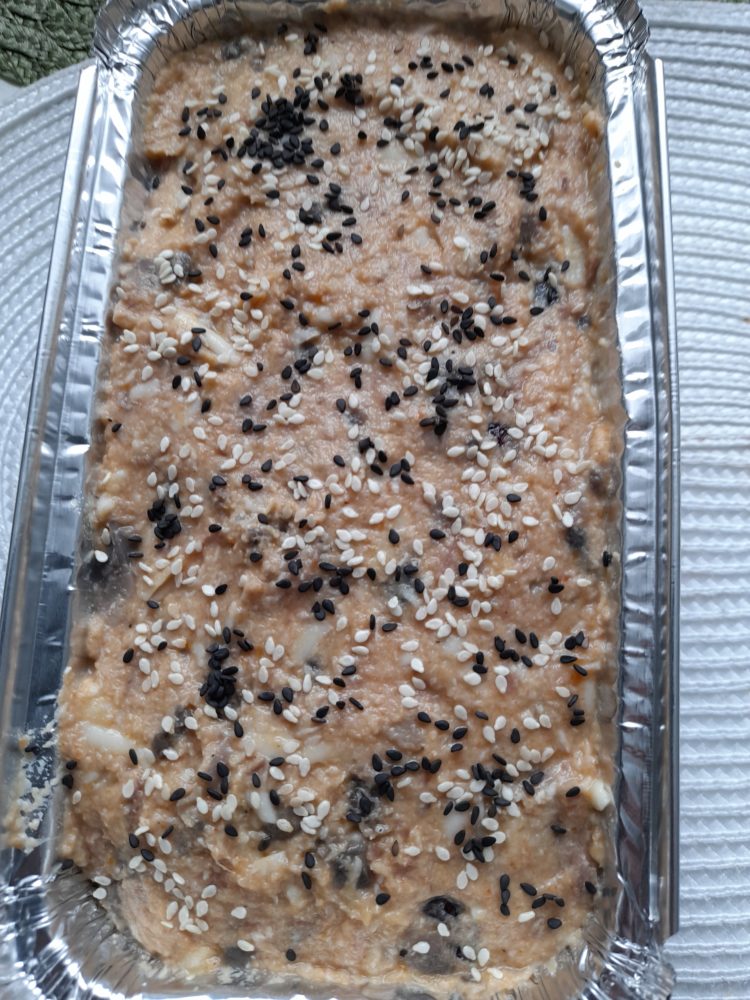 - Dodać jajka, rosół , doprawić solą , pieprzem oraz przyprawami, dokładnie wymieszać , na koniec dodać żurawinę i jeszcze raz wymieszać. Umieścić w foremce do pieczenia, wierzch posypać sezamami.