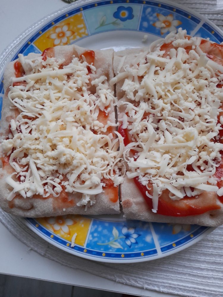 - Pinsę pokroić na 4 części lub na połowę w zależności jakie chcemy porcje. Posmarować keczupem , posypać żółtym serem.