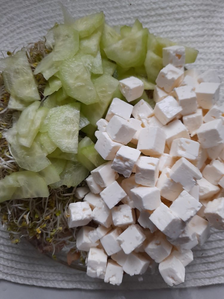 - Ser feta osączyć , dodać. Ogórka obrać , pokroić w półkrążki, dodać.