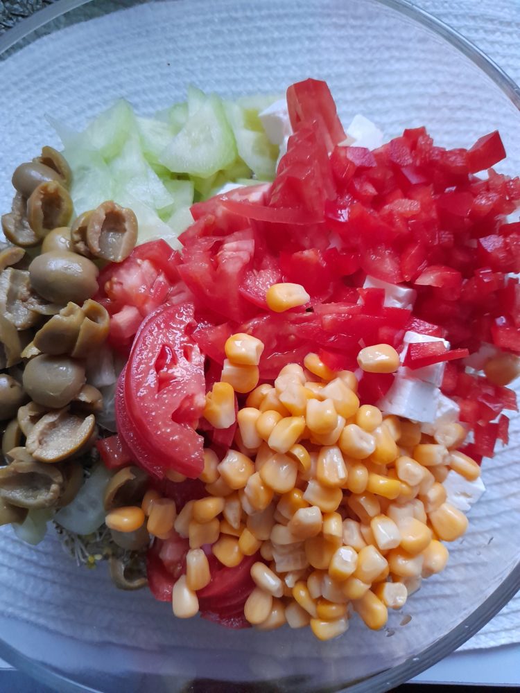 - Kukurydzę oliwki osączyć z zalewy, oliwki pokroić na połowę , dodać do sałatki. Pomidora, paprykę umyć, pokroić w kostkę , dodać.