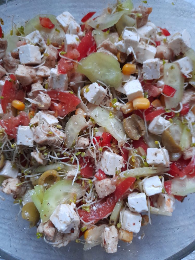 - Fileta umyć , pokroić w kostkę , doprawić solą, pieprzem, przyprawą gyros, usmażyć. Umieścić w salaterce. Kiełki pociąć dodać do salaterki.