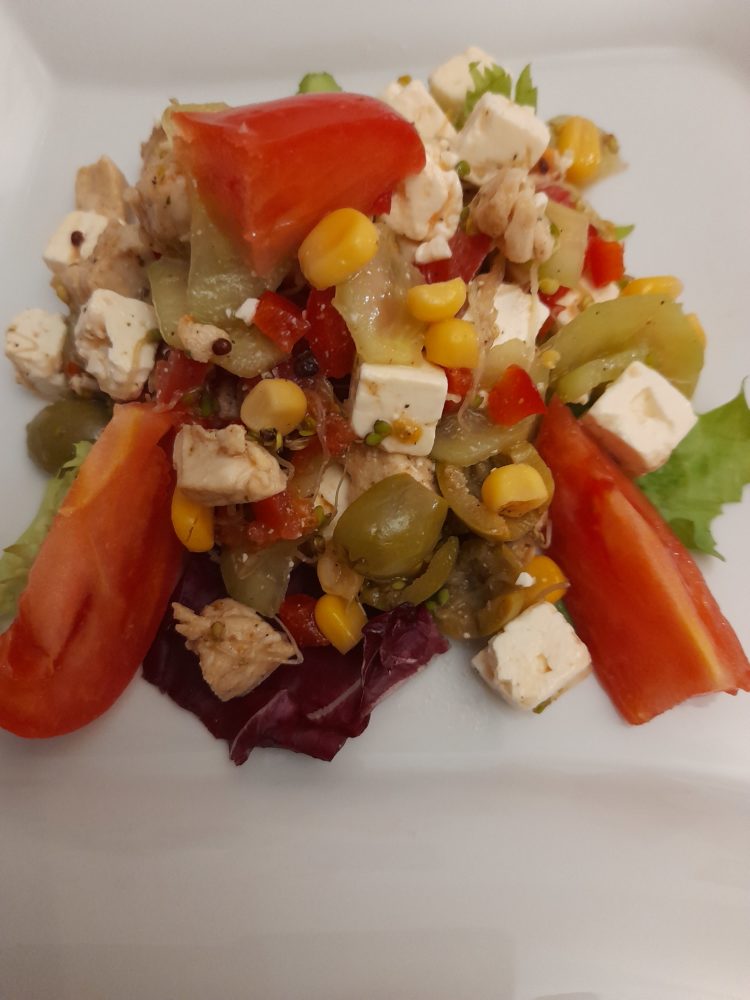 Warzywa uzupełnione , smażonym filetem oraz serem feta to smaczna i apetyczna sałatka.