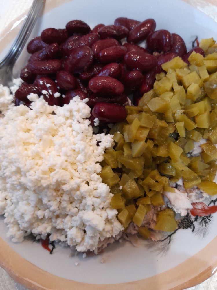 - Mięso z rosołu, zemleć w maszynce lub zblendować , umieścić w miseczce .Ser feta drobno pokruszyć , dodać. Fasolę osączyć , dodać. Ogóreczki pokroić drobno , dodać.