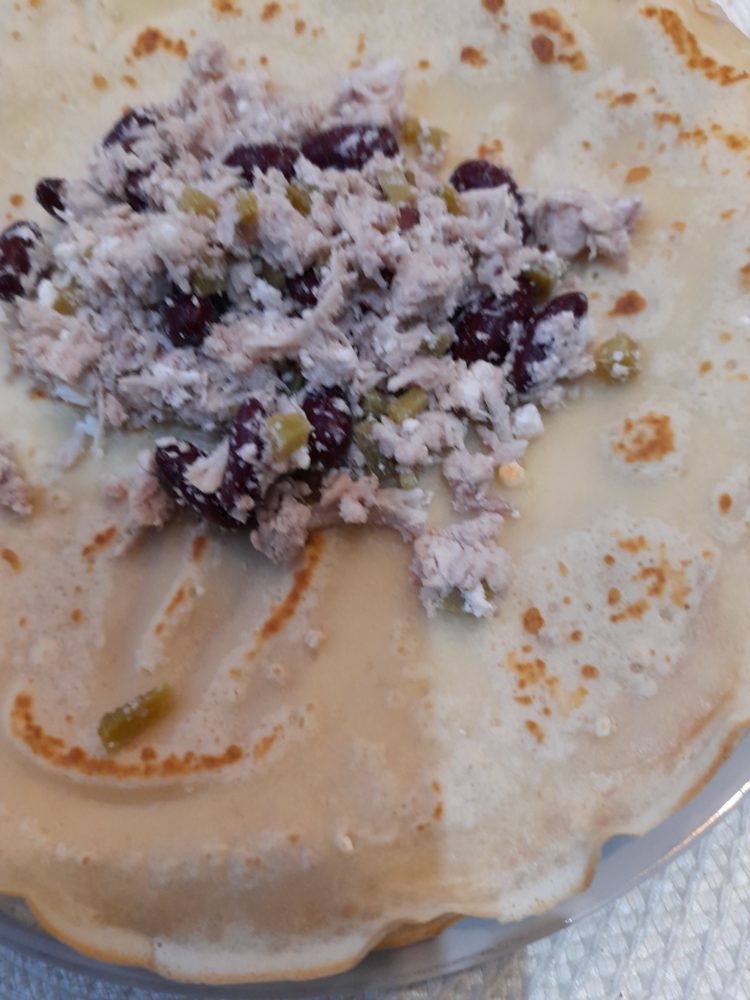 - Doprawić solą i pieprzem, wymieszać. Na rozłożony naleśnik ułożyć porcję farszu.