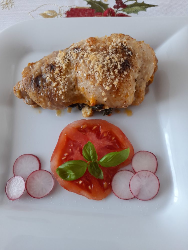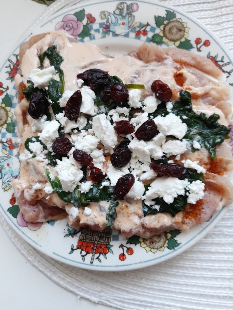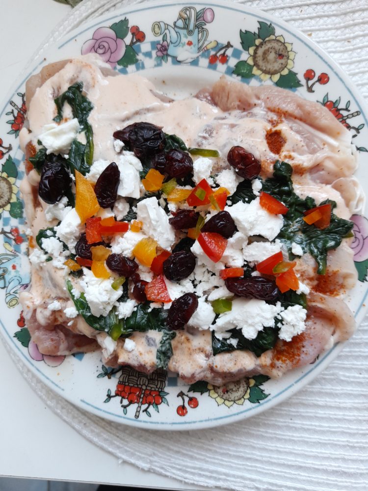 Smaczne delikatne mięso kurczaka , z dodatkami warzyw, sera feta , upieczone w panierce Panko , super danie obiadowe.