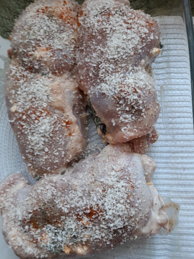 • Zwinąć w roladkę spiąć wykałaczkami , obtoczyć w panierce Panko , ułożyć w naczyniu żaroodpornym. Z pozostałymi udkami postąpić podobnie.
