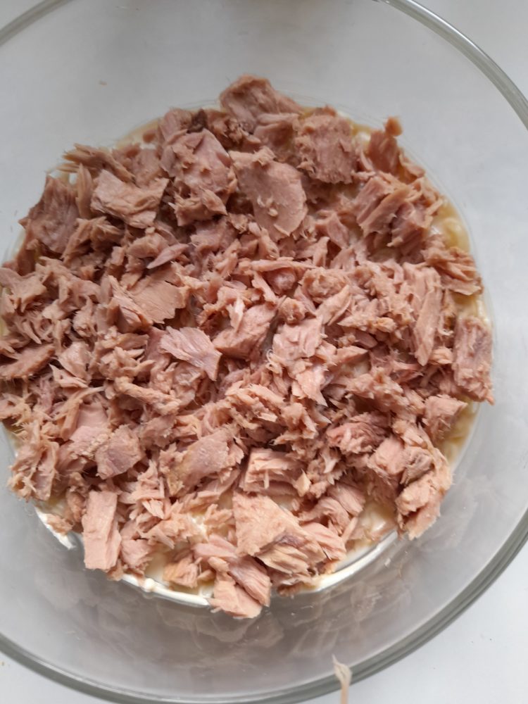 - Posmarować majonezem. Tuńczyka osączyć , rozdrobnić , ułożyć warstwę na makaronie.