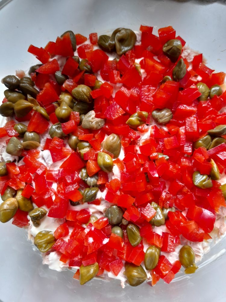 - Posmarować lekko majonezem. Paprykę umyć , pokroić w kostkę. Kapary osączyć , wymieszać z papryką , ułożyć warstwę , lekko posolić.