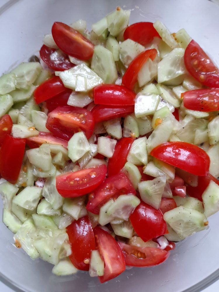 - Posmarować majonezem. Ogórka obrać pokroić w małe ćwiartki. Pomidory umyć pokroić w ćwiartki , wymieszać z ogórkami , ułożyć warstwę , posolić i popieprzyć.