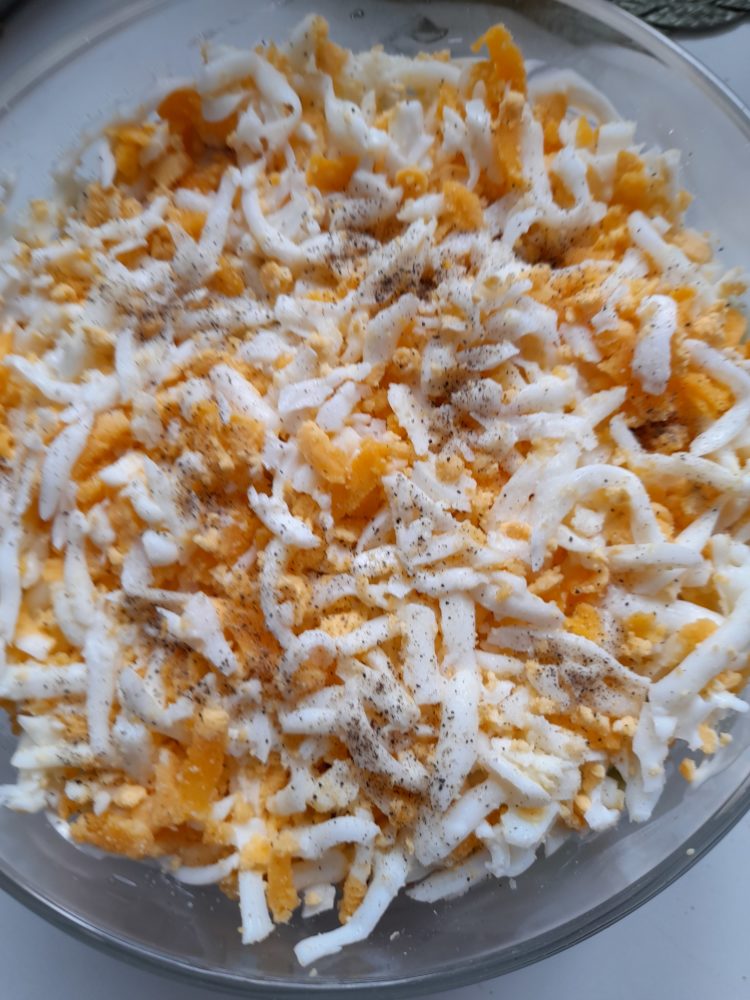 - Posmarować majonezem. Jajka ugotować na twardo , obrać , zetrzeć na tarce o grubszych otworach, posypać , tworząc warstwę . posolić i popieprzyć.