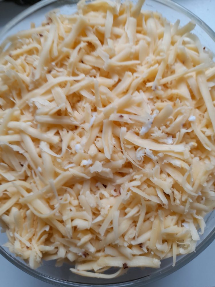 - Posmarować majonezem. Ser utrzeć na tarce o grubszych otworach, posypać po wierzchu.
