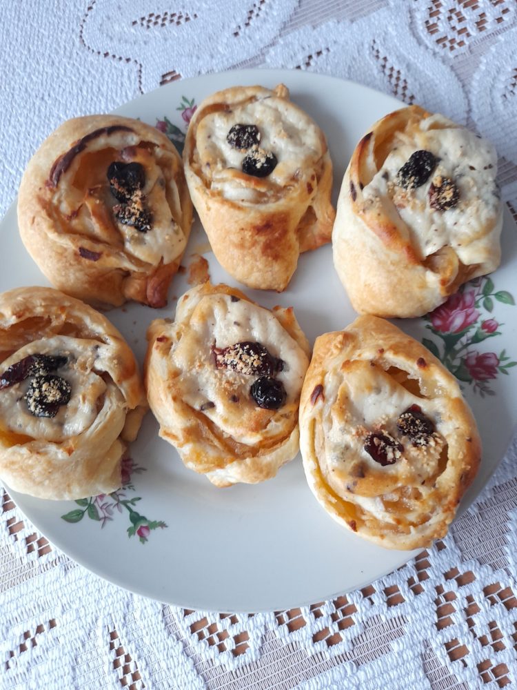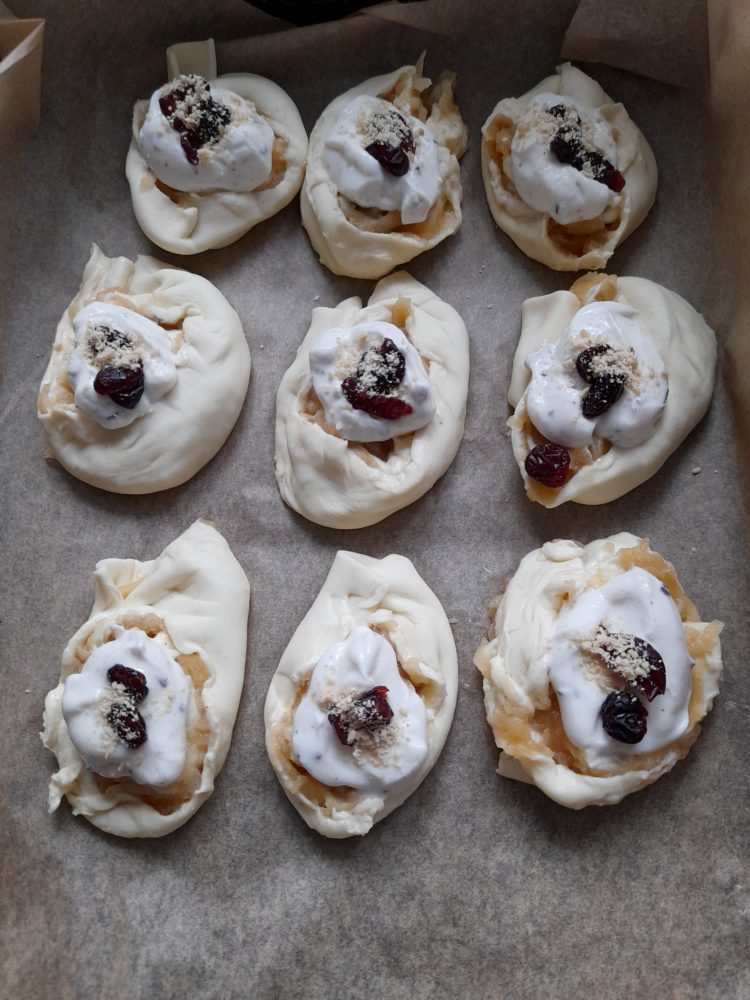 - Ciasto francuskie rozłożyć , posmarować jabłkami , zwinąć w rulon , podzielić na 9 części. Ułożyć na blaszce wyłożonej papierem do pieczenia.