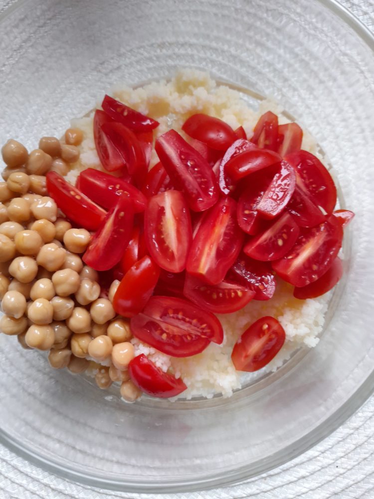 - Kuskus zalać do połowy szklanki gorącą gotowaną wodą., pozostawić do napęcznienia . Napęczniały umieścić w salaterce.