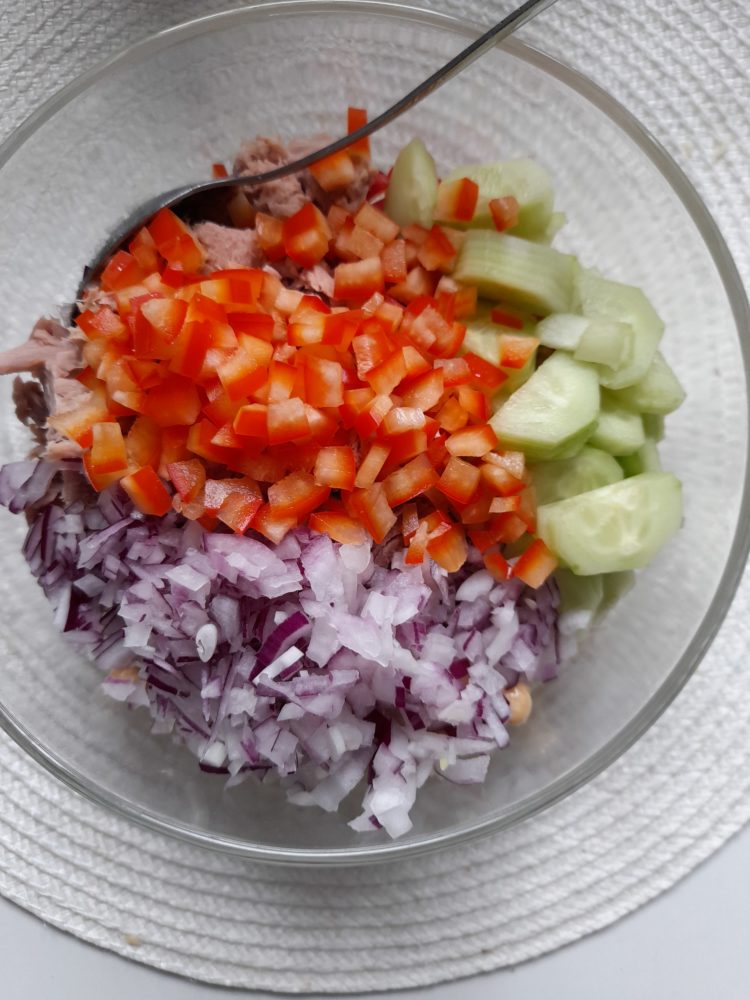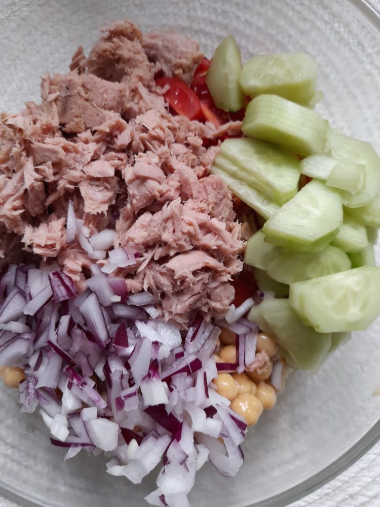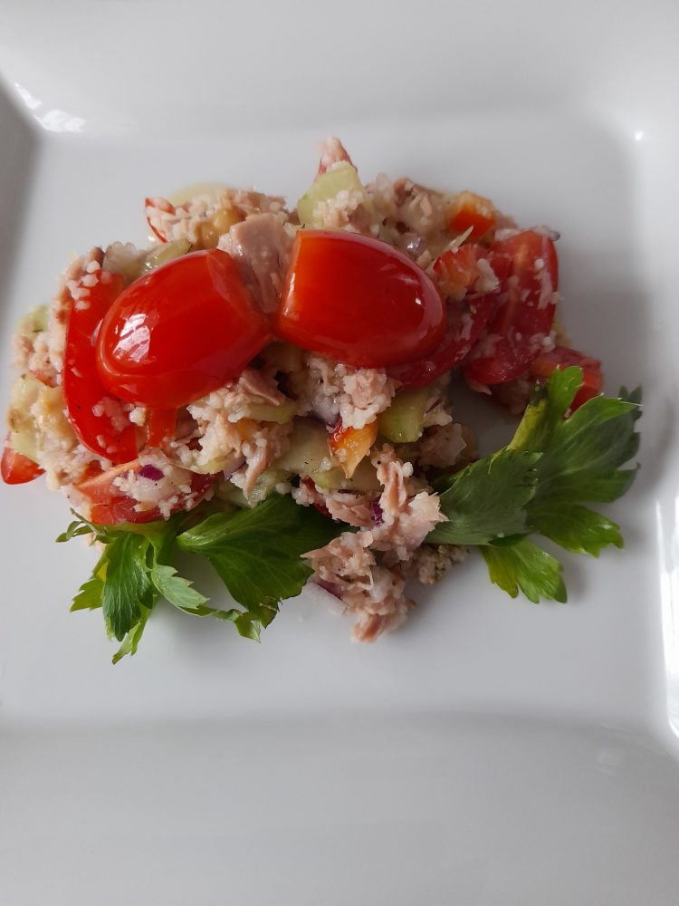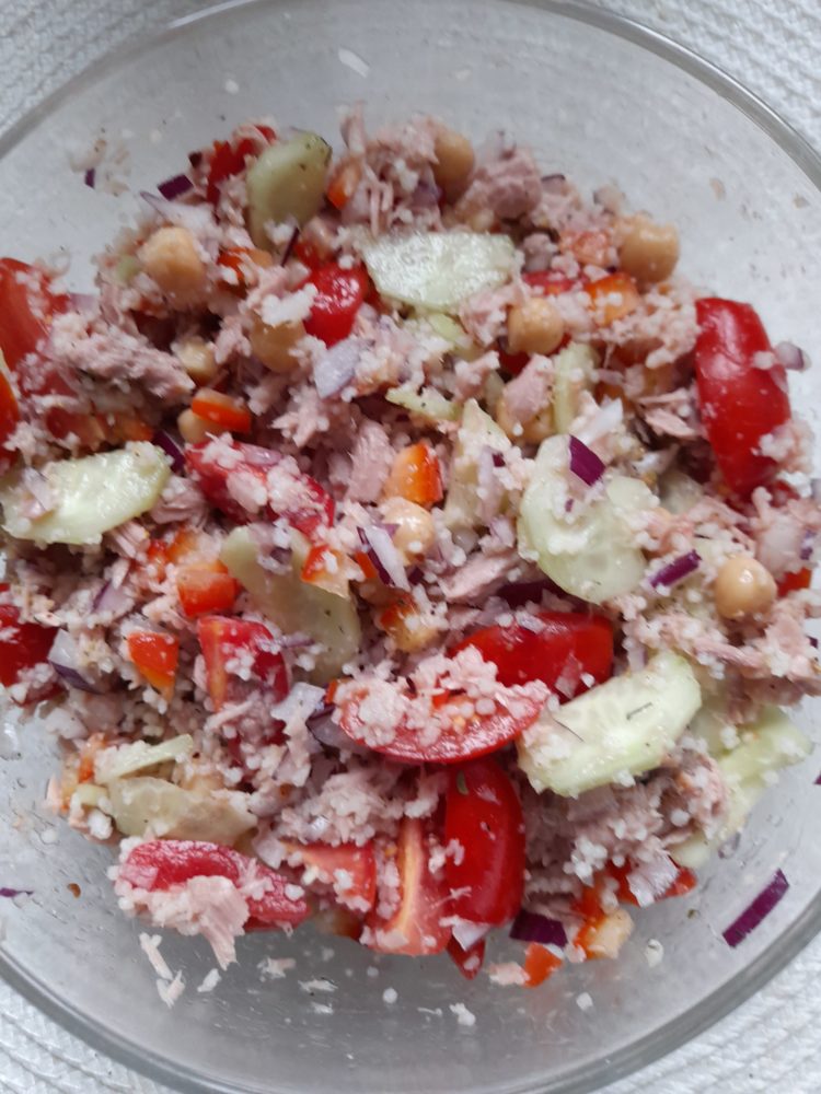Sałatka z kuskusem, tuńczykiem i warzywami , wprost na drugie śniadanie do pracy.