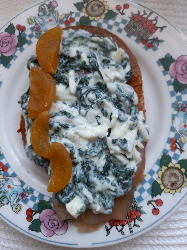 - Do szpinaku dodać 2 łyżki utartego sera mozzarella oraz 2 łyżki ricotty , jeżeli nie mamy można wykorzystać serek naturalny śmietankowy do smarowania, wymieszać , podzielić na 2 części , wyłożyć na fileta. Wzdłuż jednego boku ułożyć morele. Z drugą połową postąpić identycznie.