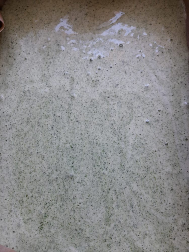 • Szpinak umyć , zblendować. Mąki przesiać wymieszać z proszkiem do pieczenia. Jajka ubić na puszysto z cukrem, wymieszać z produktami sypkimi, na końcu dodać szpinak wymieszać. Blaszkę 24 x 35 cm wyłożyć papierem do pieczenia wlać ciasto.
