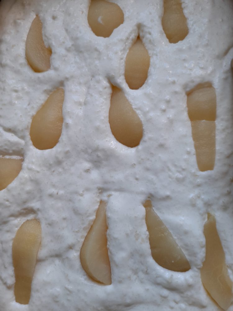 • Śmietanę ubić na sztywno , dodać ser ricotta wymieszać , dodać zblendowane gruszki oraz krzepnącą galaretkę , wyłożyć, na połowę ciasta, zanurzyć w niej cząstki gruszek.