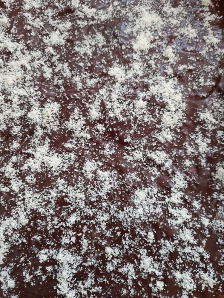 • Przykryć drugą połową ciasta. Czekoladę rozpuścić w kąpieli wodnej, wyłożyć na ciasto, posypać mielonymi migdałami.